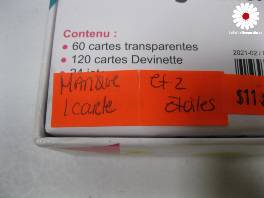 Manque 1 carte et 2 étoiles. Le prix de la poste peut augmenter avec l'achat de jouets et de livres vu le poids et la dimension de ceux-ci.