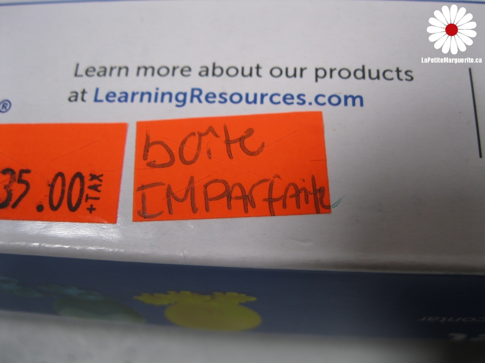 Boîte abîmée. Le prix de la poste peut augmenter avec l'achat de jouets et de livres vu le poids et la dimension de ceux-ci.